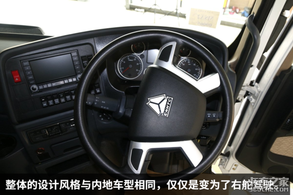 内饰方面,整体的设计风格与内地车型无异,仅仅是变为了右舵驾驶,而在设计、做工、用料方面,重汽T7都达到了目前主流高端重卡应有水准,可以为驾乘人员提供舒适的环境。