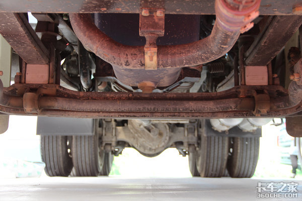 驾驶室采用4点悬浮设计,后气囊带有护罩,可以防止发动机排气的高温对气囊产生的影响,进而提高气囊的使用寿命,减少后期的使用成本。在车辆排气管使用了铸造件的抱箍,能轻松应对发动机高温工况,据厂家工作人员介绍这是陕汽所独有的,比一般的抱箍强度更高,使用起来更加安心。