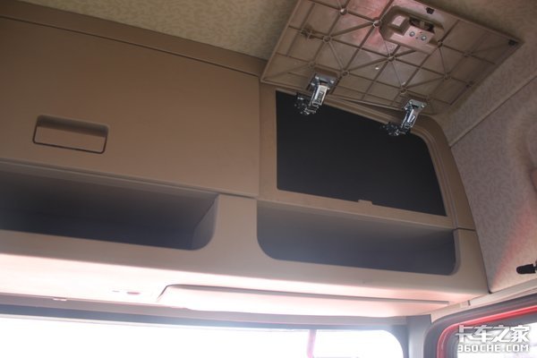 驾驶室上方有多个不同大小的储物格,深度以及高度适中,可满足日常生活放置物品的需要,但是下方的储物格并没有安装防护网,在行车中存在物品掉落的安全隐患。