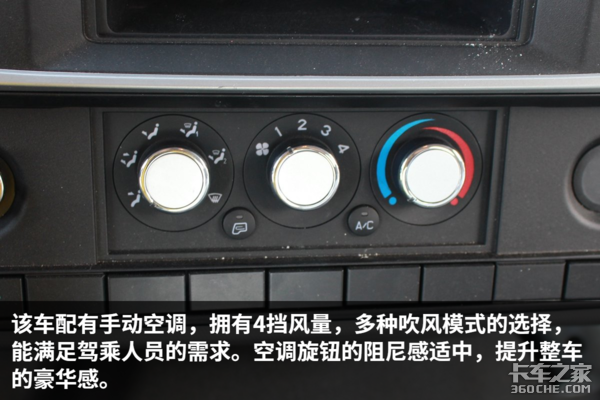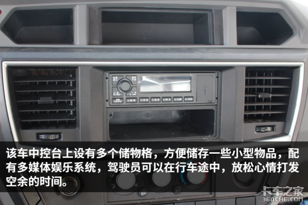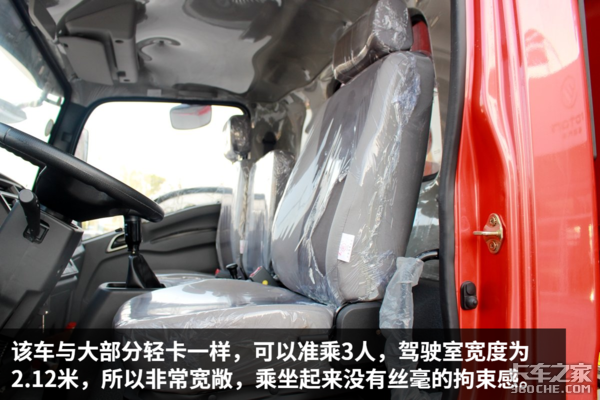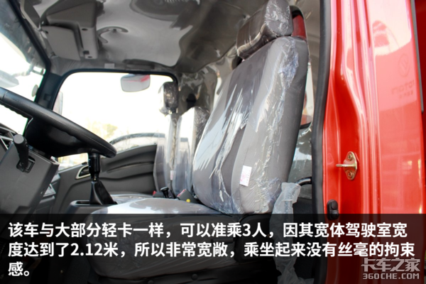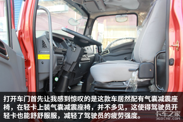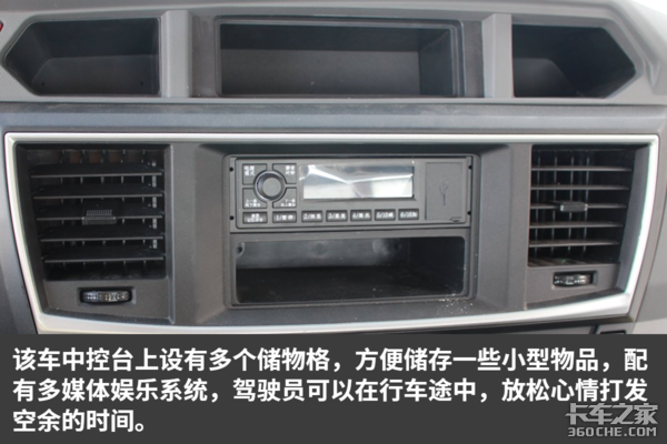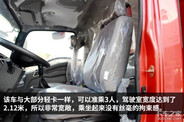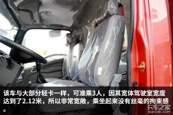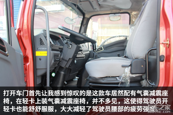 该车驾驶室做工规整,内部细节也比较考究,各种旋钮开关的阻尼感适中,操作方便,提升了整车的豪华感,总体来说,该车的细节设计与做工比较不错。除此之外,车内设有多个储物格,可以方便驾驶员零散物品的储存。由于是宽体驾驶室,因此车内空间宽敞,司机在车内基本没有压抑感。值得一说的是,这辆车竟然可以选装气囊减震座椅,这在国内的轻卡中比较是少有的,气囊减震座椅缓解驾驶员的疲劳强度,相信这个配置,一定能得到驾驶员的喜爱。