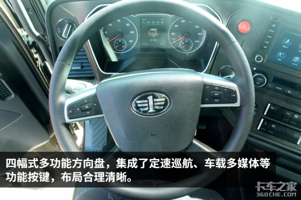 中控台上集成了具备电容触摸屏设计的8寸液晶显示屏,自带收音、导航、蓝牙功能,能很好的缓解路途疲劳;同时配备了自动车空调,并且开关阻尼适当,贴近乘用车设计。并且,动力模式转换开关、挂车制动拉手与断气刹拉手、差速锁等开关都集聚在驾驶员能方便操作的地方。