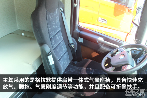 一款好的座椅能有助于减轻驾驶员在途中的颠簸,J7主驾采用的是格拉默提供肩带一体式气囊座椅,具备快速充放气、腰拖、气囊刚度调节等功能,并且配备可折叠扶手。