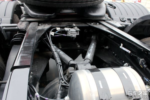 实拍该车采用13吨后桥,速比3.7,前后钢板弹簧数为2/4片。然后有气囊悬架可选。