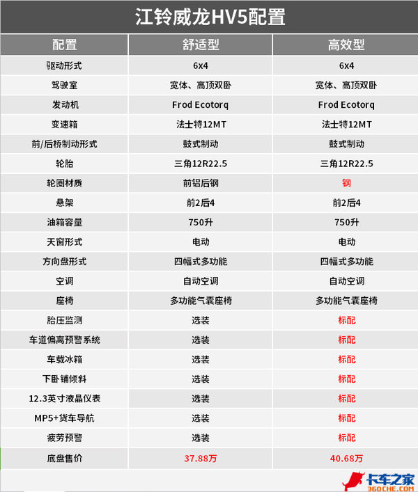 江铃威龙HV5全系标配750L铝合金燃油箱,可选装双腔燃油箱和燃油加热功能,可以满足寒冷地区运输使用。
