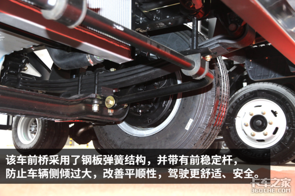 前桥采用少片簧钢板悬架结构,片间增加胶垫,可降低车辆在行驶中钢板之间的摩擦噪音并减小震动,改善平顺性。同时带有前稳定杆,防止车辆横向侧倾过大,增加安全性。