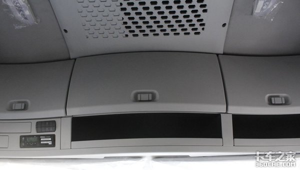 车顶上方正中央是驻车空调系统装置可以手动操控,当停车驾驶员休息时,冷风可以从上方吹出来,在炎炎夏日,即便在后排卧铺上睡觉,也可以直接感受的冷气的凉爽。