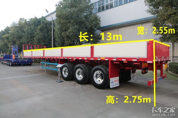 这款挂车的外形尺寸为:13x2.55x2.75(m),符合了GB1589-2016对于三轴栏板挂车的尺寸要求。这款车最大的特点就是自重轻,承载吨位大,整车自重仅4.8吨。