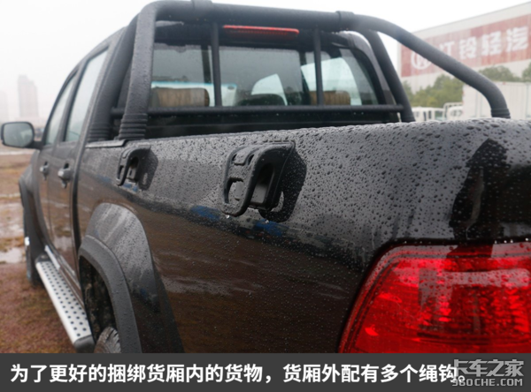 针对载货的特性,在货厢方面骐铃T7也有许多细节方面的设计值得称赞,首先长轴距带来的长度超1.8米的货箱,有效提升了装载空间,其次货箱内部全系涂装了货箱宝,防滑并且免得刮伤货箱。同时为了更好的捆绑车厢内的货物,货箱为配有外置绳钩,而粗壮的高强度防翻滚架也能充当固定点。