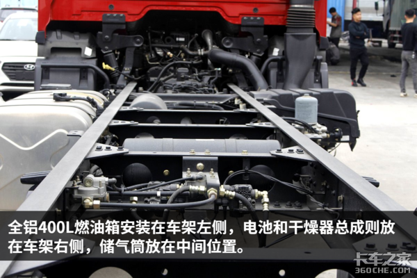 整体来看,车辆底盘布局合理,全铝油箱造型美观,储气筒放在车架横梁中间节省空间,管路采用优化方案,不容易磨损,主副钢板弹簧悬架承载性强。