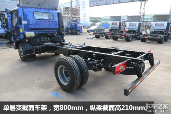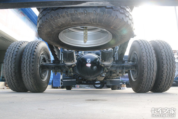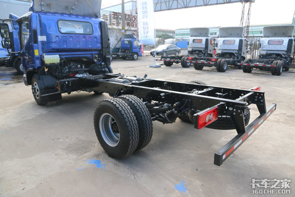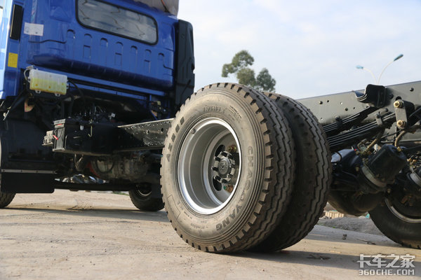 该车加宽了驱动桥,公告数据后轮距为1.8米,手工测量后轴最外宽(两侧胎肩的距离)为2.25米。它跟奥铃捷运(重载版)的轮距应该是相同的,而由于奥铃捷运采用的是8.25轮胎(该车是7.50轮胎),所以会更宽一点。