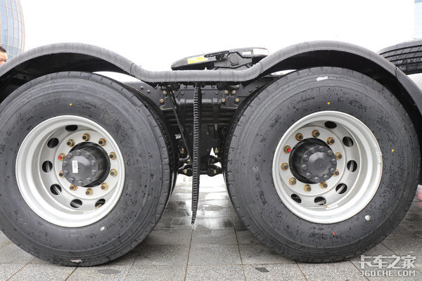 后桥采用的是2*FS160后桥,速比为3.417,并且采用了康迈的轮端。大马力+小速比的设计主要运用于高速物流运输市场,也是目前长途标载物流运输市场常见的配置。
