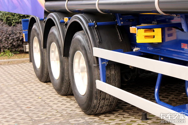 挂车轮胎采用大单胎,与欧洲挂车类似,在欧洲只要是标载情况下的物流运输,一般都采用单胎挂车。轮胎型号是425/65R22.5,品牌是双钱。