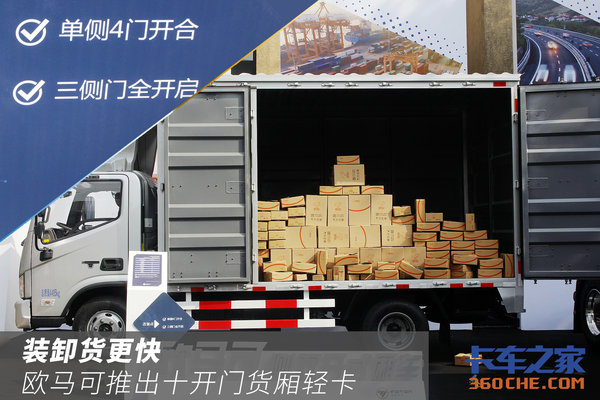 来卡车之家App【卡车之家 原创】为了提升装卸货效率,欧马可推出了十开门货厢的轻卡,单侧4门设计,加上尾门,车厢实现三侧全开启,城市街道小巷的配送效率可极大提升。