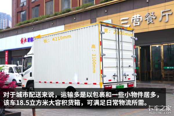 J6F电动车目前可选择两种不同尺寸的货厢,分别为4210x1910x1900mm与4210x2100x2100,装载容积为15.2立方米和18.5立方米,用户可根据自己运输需求来进行选择。18.5立方米货厢在城市配送中有着明显的空间优势,满足多种货物装载,一次可拉更多货物,提高运营效率。