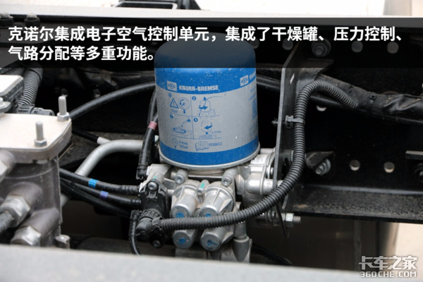 除了盘式制动器和EBS之外,这款车制动系统中的各个阀件都采用的是克诺尔的产品。例如这款克诺尔的集成电子控制单元,它集成了干燥罐、压力控制、气路分配等多重功能,可以根据储气罐中的压力来调节进气量,保障储气罐的气压合理,保证制动系统的可靠性。