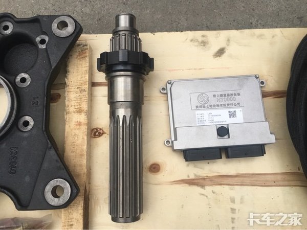 因为本次改装液力缓速器为串联式结构,液力缓速器需直接装在变速箱动力输出端,然后再连接传动轴。因此,在零部件当中,除了液力缓速器本体之外,有两样非常重要。变速箱后盖支架和“加长版”变速箱输出轴,稍后详细说明。