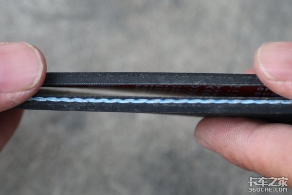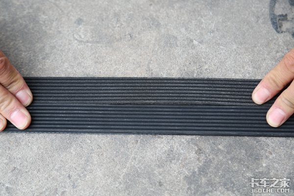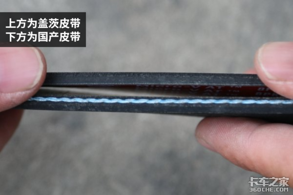 皮带侧面对比,国产皮带更厚,卡友们可能会有个误区,皮带越厚越结实,其实不然。多楔带带轮较小,皮带在运转时变形量较大,带体越厚产生的热量就越大。