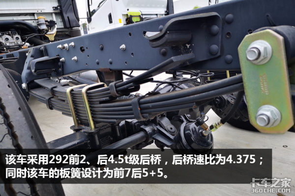 该车采用292前2、后4.5t级后桥,后桥速比为4.375,这样的速比也是充分考虑到轻卡多样性的需求;同时该车的板簧设计为前7后5+5的板簧设计。