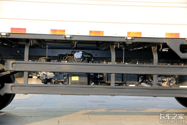 底盘部分布局也进行了优化,油箱与尿素罐和电瓶分别布置在了车身两侧对于车辆底盘利用率更高,重量分布更平均。