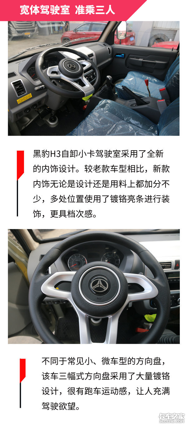 来卡车之家App【卡车之家 原创】对于不少乡镇地区或需进出地下停车场的小型工程建设来说,由于路面较窄、高度限制等多种原因,导致中、重型自卸车无法进入。因此,针对这部分细分市场的运输,不少车企推出了小自卸车型,黑豹H3自卸小卡正是其中之一。