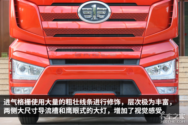 整体外观相较解放以前的车型,除了更大更宽之外,设计也更具立体感。其实从部分细节上我们能看出,J7延续了解放不少经典的设计元素,特别是前脸进气格栅蜂窝状的圆形小孔和鹰眼式的大灯,时刻告诉大家这是一辆解放卡车。