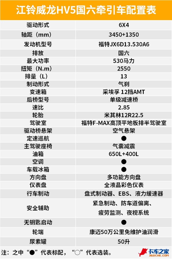 ● 底盘点评:江铃威龙HV5在动力链的匹配上跟欧洲卡车可以说是无异,整车的配置也是非常高的,比如EBS、液缓、盘式制动、AMT变速箱、气囊悬架等等。当然了,针对中国市场,这款车也有一定的改良,例如轮端就采用了康迈油润滑轮端。