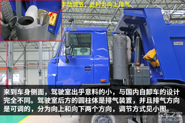 驾驶室后方的圆柱体是排气装置,并且排气方向是可调的,分为向上和向下两个方向,调节方式见小图。