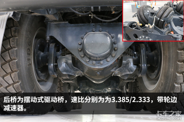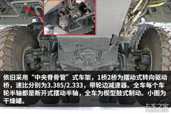 1桥2桥为摆动式转向驱动桥,速比为3.385x2.333,带轮边减速器。全车为楔型鼓式制动。(小图为干燥罐)
