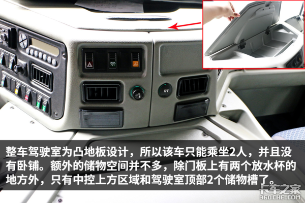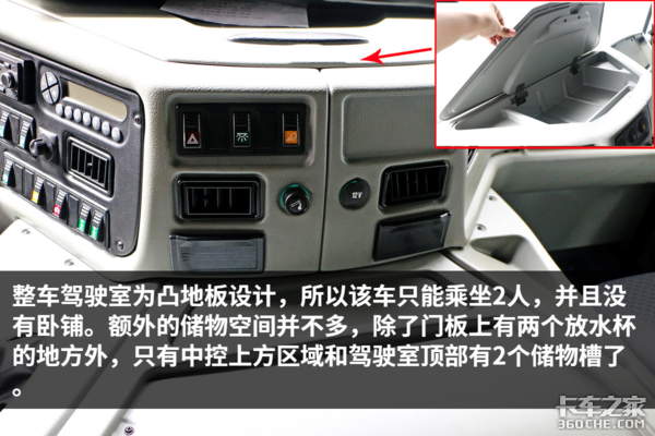 额外的储物空间并不多,除门板上有两个放水杯的地方外,只有中控上方区域和驾驶室顶部2个储物槽了。