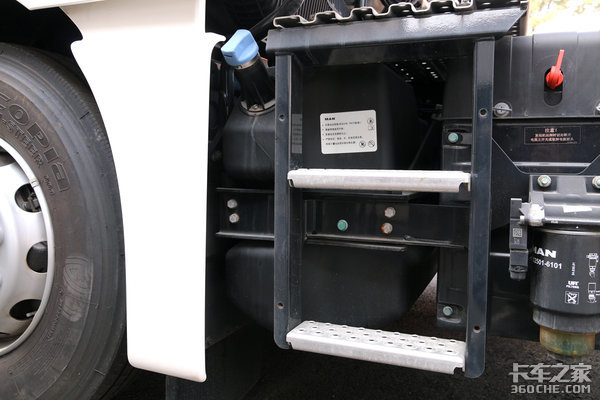 曼恩TGX的底盘布局非常紧凑,几乎每一厘米的空间都需要被安排上它的使命。75升的尿素罐在车架左侧,跟工作台登车梯紧密连接,只给尿素罐加注口留出位置。