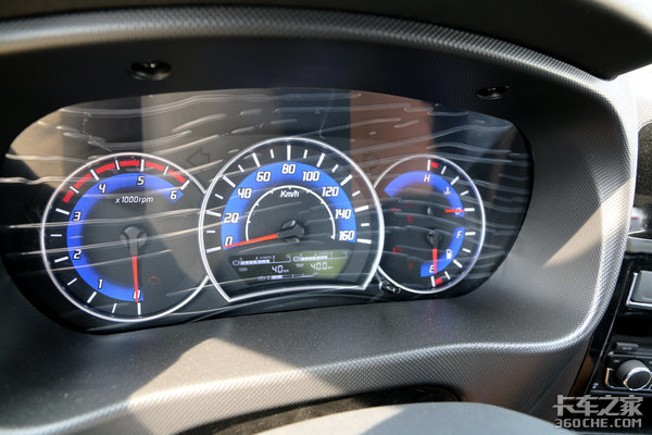 蓝底红字的三联仪表显示数据清晰精准,仪表盘为3D 3.5寸TFT单色屏,具备显示油耗、里程、车辆状态等功能,下方的液晶显示屏可以显示气压以及公里数等基本信息。最右侧为水温表和油量表,整体质感为内饰带来不小的活力。
