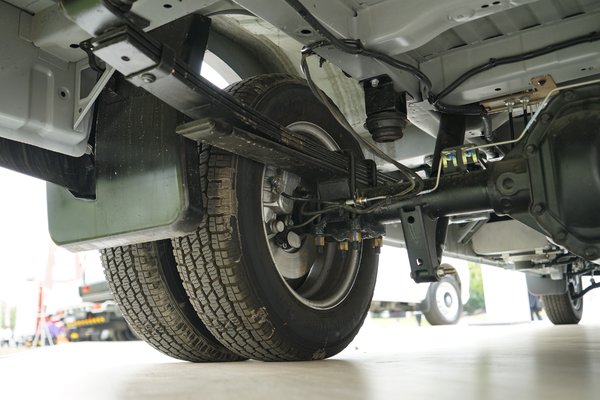 在后桥可以看到,后桥采用了少片簧、速比为2.5的整体桥,吨位为3吨,同时还带有2支粗壮的减振器,这在一定程度上也增加车辆的舒适性。