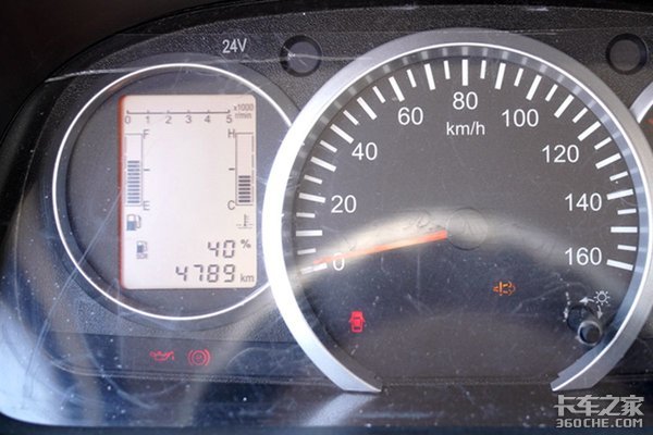 仪表使用三联表,最右侧配备了橙色的显示屏,显示信息也较为新颖,转速表、油量显示、尿素量显示、以及水温表都集成在显示屏上。