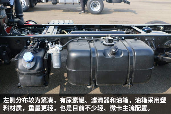 车辆将储气罐集中设计在车架内,不仅可以起到保护作用,还可以为外侧预留出更多改装空间。同时采用高强度钢材制作车厢车架,配合车上多处轻量材料,有效降低车身自重,多拉货的同时还保证了一定的燃油经济性。