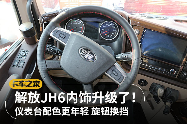 有眼尖的卡友可能也看出来了,这款车的地板上空空荡荡,没有之前AMT版JH6那个硕大的挡杆“鼓包”了。这是因为,之前的实体挡杆,已经被升级为了和自家旗舰车型解放J7类似的旋钮换挡,并集成到了仪表台上。