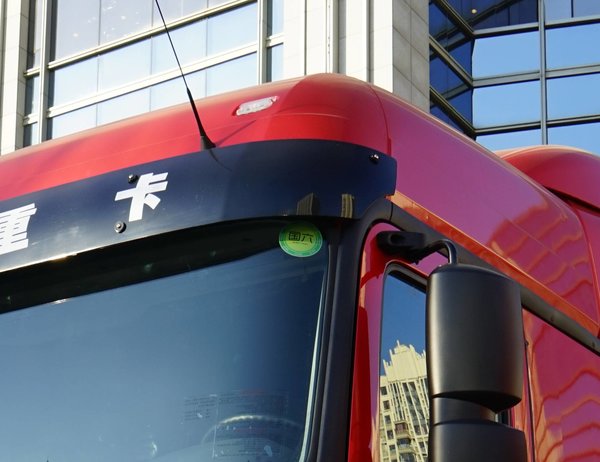 这款V3ET牵引车具备国六排放标准。不过北奔这款牵引车的国六标识真是太低调了,一张如交强险大小的国六标识贴纸贴在风挡玻璃内侧上方,不注意看都看不出来。