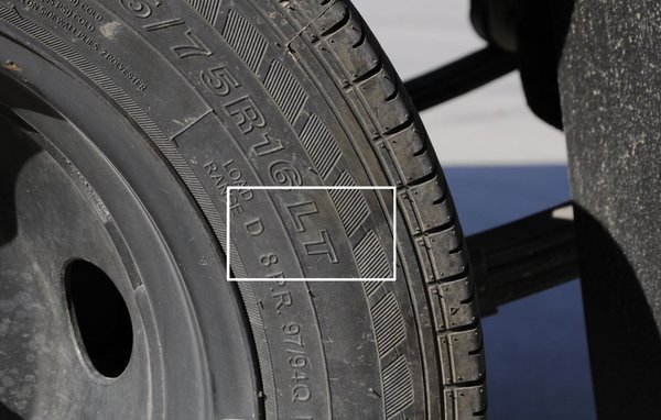 如上图所示,该轮胎型号为7.00R16LT,这里的7.00为英制单位,表示轮胎横断面宽度为7英寸,R表示子午线轮胎,16表示轮圈直径,LT表示轻型载货汽车轮胎。