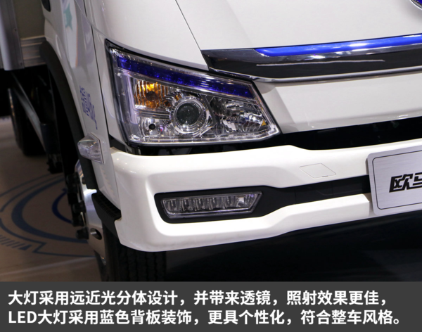 欧马可智蓝取消前进气格栅,整体看上去更加简洁轻快。中间一根蓝色装饰条起到画龙点睛的作用,衔接整车设计理念。同时大灯和车标也采用了大胆的蓝色进行点题,为车辆营造了特殊的视觉美感。