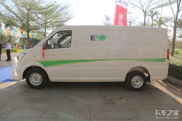 车身侧面布局较为规整,使用了绿色的车身拉花,配合上白色的车身,让整台车看上去更加小清新,也符合新能源车型宣传理念,同时“EV电动汽车”的LOGO进一步证明着此车为一辆新能源车型。