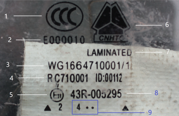 图中标识的厂家自编码并非玻璃通用代码,这里的代表厂家的配件编号,这里的WG1664710001/1代表这块玻璃为重汽T7前风挡玻璃总成,型号为WG1664710001/1。
