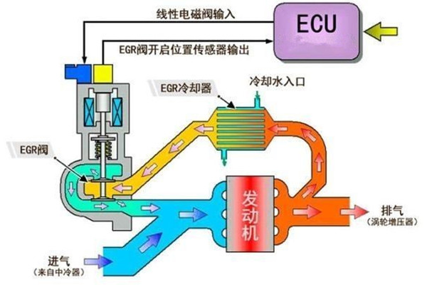 为了抑制氮氧化物的生成,EGR系统从氮氧化物形成的反应条件入手,通过将含氧量较低的废气经冷却装置再度传递至进气歧管内,从而使进气温度,氧气含量降低,以破坏氮氧化物形成的反应条件和反应物含量,从而达到抑制产物形成的目的。