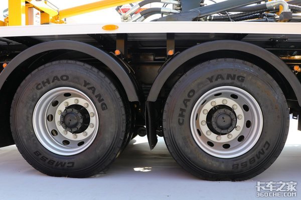 后轮使用了315/80R22.5的“麻将块”轮胎,由于这辆车经常要出入建筑工地等非铺装路面,对于轮胎附着力的要求较高,使用这样的轮胎也算情理之中。并且得益于工程车的身份,对于自重的要求不敏感,整车还是使用了钢制轮辋,强度方面同样出色。