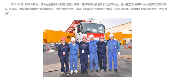 此次在火神山医院现场出现的“送灰宗”正是使用了国产设备,当然我们的国产设备并不只出现在我们国内的各大工地上,在2011年的日本大地震中,三一的泵车就担任了为福岛核电站泵送冷却水的任务,让世人看到了中国技术,中国制造。