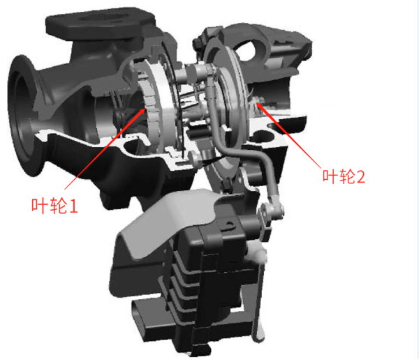 涡轮增压器可以大致分为涡轮仓和压气仓,每个仓各有1个叶轮。为了方便说明,我们将2个叶轮称为叶轮1(进气)和叶轮2(排气)。