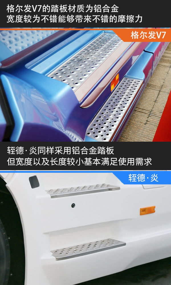 登车踏板方面,两车表现较为平均,基本都可以很好满足驾驶员上下车的需求,安全性、耐用性上做的相对不错,只是轾德·炎在长度上有些缩短。