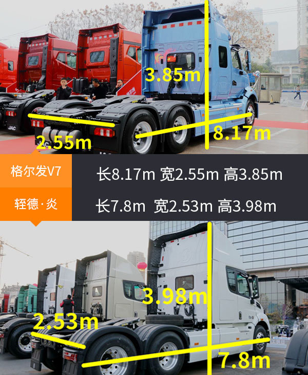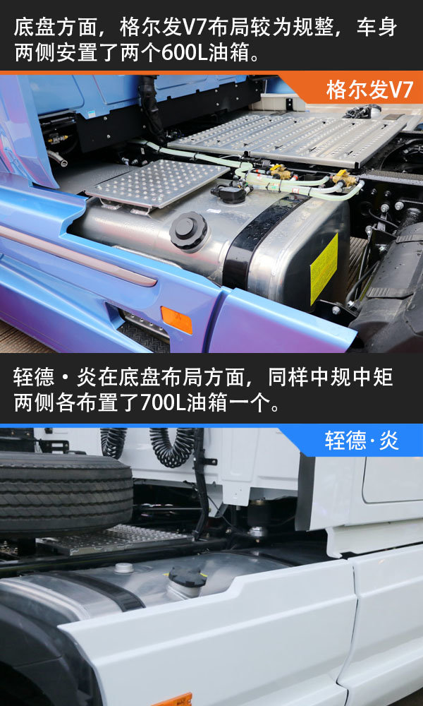 两台车在油箱方面,都是名副其实的大胃王。格尔发V7的油箱总容量达到了1200L,轾德·炎油箱总容量更是达到了1400L。以车货总重49吨百公里油耗33升计算,格尔发V7加满油能够拥有3600公里的续航成绩。