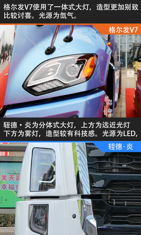 进气格栅部分两车走的是两种路线,格尔发V7的更为大气,轾德·炎的更偏年轻。这能明显看出两家厂商在对车型同质化说不,虽同是长头车但也能给用户不同的视觉体验。