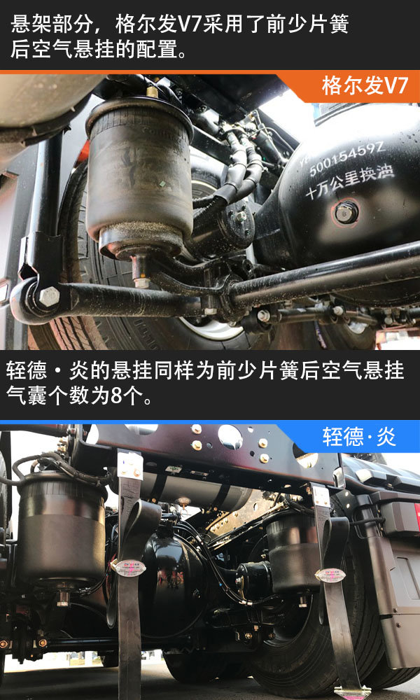 根据两款车的悬挂配置不难看出,长头车配备空气悬挂已经成为主流,这样的配置既可以保证行车舒适性,对于车辆的适应工况也会更加宽泛。