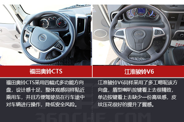 通过驾驶舱内的对比可以看出,骏铃V6在中控台装饰以及储物空间分配很用心,内饰整体感觉新颖,对于注重美观和时尚的卡友可以考虑骏铃V6;而奥铃CTS的内饰设计更加倾向于实用化,整体上中规中矩,更加贴紧乘用车。卡友可根据自己的喜好和需求,选择相应的车型。