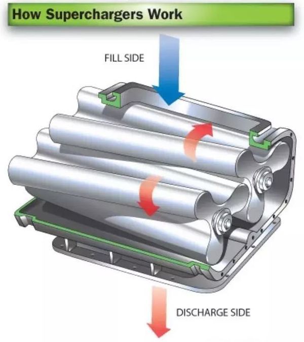 简单的理解鲁式增压器就像是一个绞肉机,这里的的肉就是空气。空气垂直于转子轴线方向进入,再以同样方向流出。